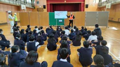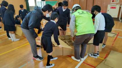 5・6年生は、地域防災リーダーや区役所、町会の防災担当、消防署などの方々に来ていただいて、防災学習を実施しました。まず、「自助・共助」のお話を聞き、段ボールベットや簡易トイレなどを組み立て、避難所設営の備えについて学びました。6年生は、救急救命法(心肺蘇生法)を実際にやってみました。1月1日の石川県の地震の後、3週間も避難所生活が続いていることもあるのか、みんな真剣に取り組んでいました。