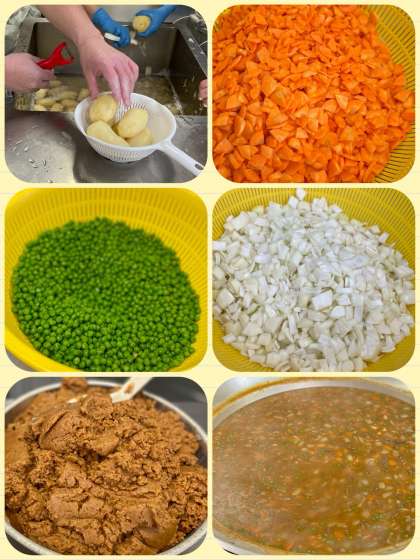 ワインで下味を付けた牛肉、たまねぎ、にんじんをいため、じゃがいもと水を入れて煮込み、ルウを加えて味付けをしてグリンピースをいれて仕上げています。
