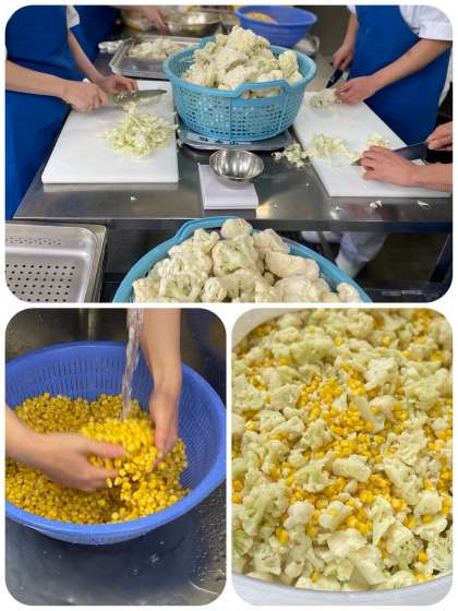 ビーフシチューのルウは給食室で綿実油と小麦粉を褐色になるまで炒めて作っています。