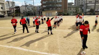 子どもたちは「ふえおに」で体を温めてから、ラグビーボールを使っての準備運動をしました。ラグビーボールを初めてさわった児童もいました。そのあと、パスの練習やタックルの練習などもしていました。子どもたちは大喜びでした。