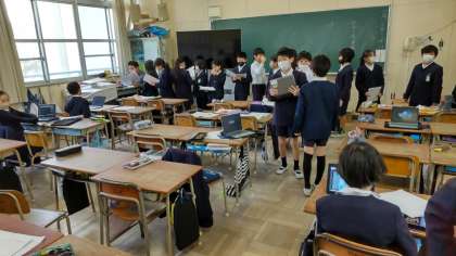 4年生は国語科で、「百人一首」の暗記にがんばっています。中には、パソコンを使って覚えている人、登校中歩きながらプリントを見て覚えようとする児童などいろいろです。これは先生に覚えた「百人一首」を聞いてもらってのテストなのかもしれませんね。
