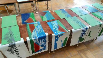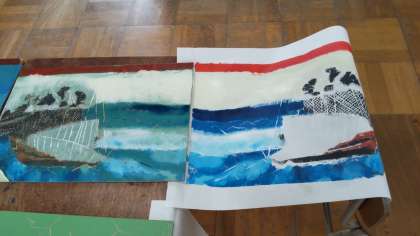 6年生は小学校最後の作品になるかもしれませんが、浮世絵の技法を使った多色刷りの版画に取り組んでいます。まだ半分くらいの完成度でしょうか?なかなかきれいです。何回も版に絵の具を塗って重ねて刷っていきます。