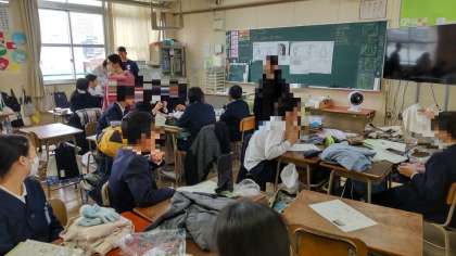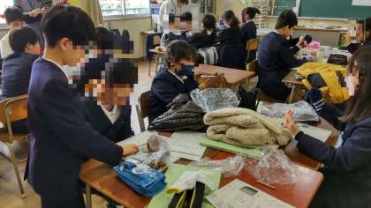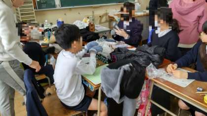 6年生は家庭科の時間に家から防寒着や手袋を持ってきて、「暖かな服の着方」について学習しました。空気を遮断する素材の生地でできたジャンパーやダウンジャケットなどについて調べていました。また手袋の下にもう1枚薄いビニル手袋をつけてみると、暖かさが増すことも確かめていました。