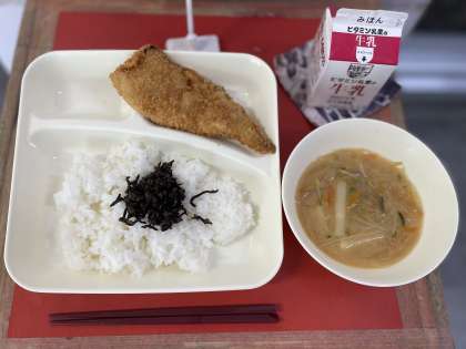 今日の給食では、いわしをフライにしています。骨ごと食べることができるので、骨や歯をじょうぶにするカルシウムもたくさんとることができます。