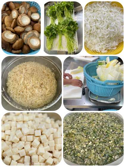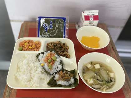 手巻きご飯は、牛肉のコチジャンいためと、さけのカラフルそぼろを、手巻き焼きのりでごはんと一緒にまきます。牛肉のコチジャンいためは、牛肉、にんじん、切干しだいこんをにんにくの風味をいかしていため、砂糖、濃い口しょうゆ、コチジャンで味付けし、青みににらを加えていためています。さけのカラフルそぼろは、紅ざけフレーク、むきえだまめ、コーンを混ぜ合わせて、砂糖、塩、ワインビネガー、薄口しょうゆで下味をつけ、焼き物機で焼いています。