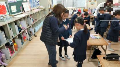 1年生は、本校に来ておられるキャスリーン先生と一緒に、あいさつの仕方を習い、友達とあいさつを英語でかわしていきました。「My name is 〜」「Nice to meet you」などです。