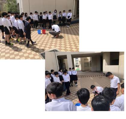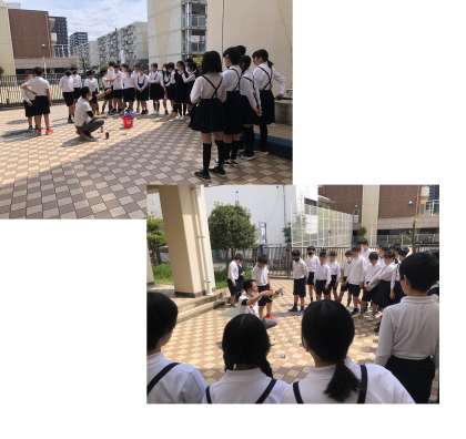 6年生では、理科の学習で「ものの燃え方と空気」の学習を、先生による演示実験として屋外で行っていました。