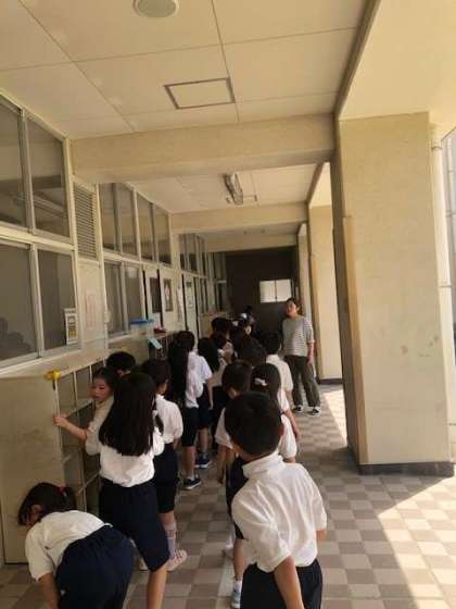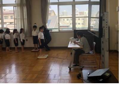 今日は、1年生の発育測定がありました。1年生の子どもたちは体操服に着替えて、教室前で並び、多目的室に移動しました。