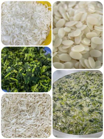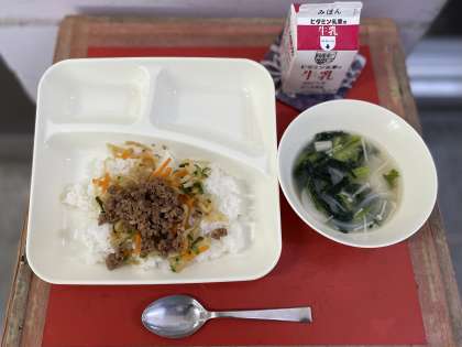 今日の給食のビビンバの具は、コチジャンで味付けした肉と、きゅうり、にんじん、切干しだいこんで作ったナムルでした。