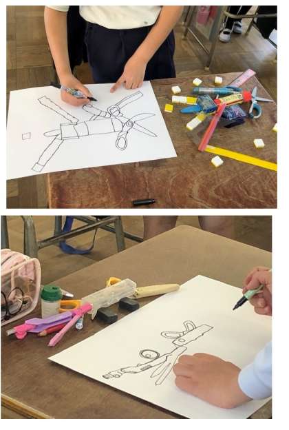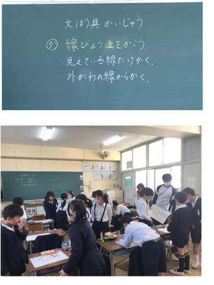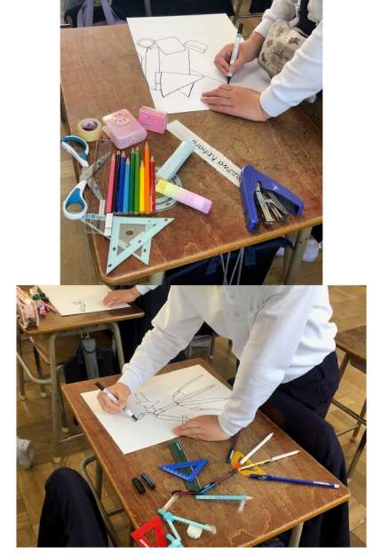 4年1組の教室では、図工で「文ぼう具かいじゅう」という線描に取り組んでいました。自前の文房具を組み合わせて怪獣を作り、それを見えている線だけで描いていくというものです。