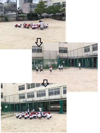 子どもたちが座って下を向いた状態から、先生の合図で先生がいる場所まで走って行き、先生が指の数で示した並び方で整列します。