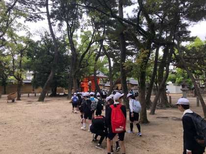5年生は西宮神社を散策した後、お弁当を食べて学校に戻り始めました。