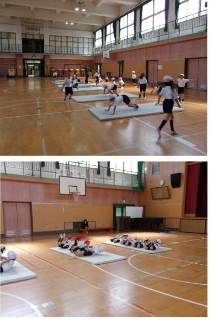 2年2組では、体育館で「マットを使った運動遊び」をしていました。グループごとに割り当てられたマットで、様々な運動をしていきます。