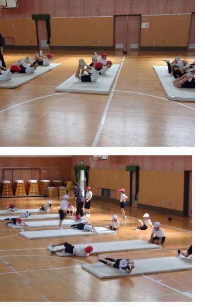 うさぎ跳び・ゆりかご・えんぴつ転がり・でんぐり返しなど、いろいろな運動を通して感覚づくりをすることがねらいです。