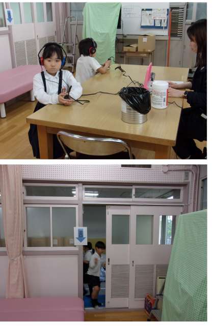 2年2組では、まず、教室でオージオメータの使った検査の受け方を保健の先生から伝えてもらいます。ヘッドフォンの赤は右で、青は左です。音は低い音と高い音の2種類で、音が鳴っている間だけボタンと押し続けます。さすが、2年生、すぐに理解して8人ずつが保健室へ移動して検査を受けます。