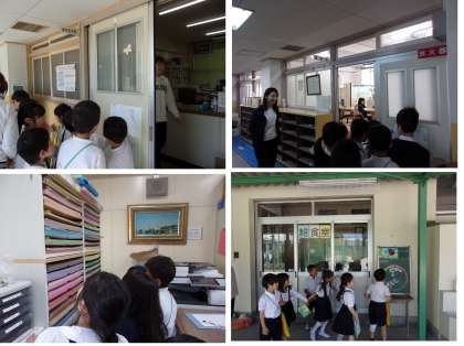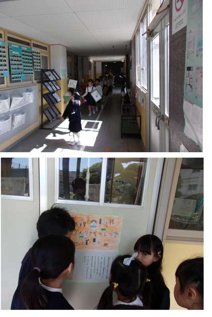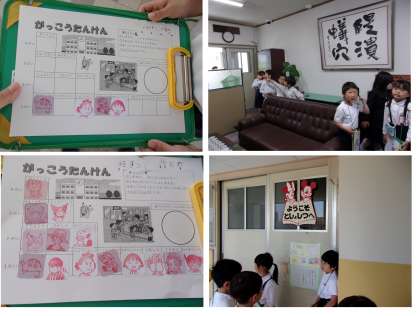 1時間目と2時間目で、学校探検がありました。2年生のお兄さんお姉さんが、自作の旗を持って、1年生を誘導して、いろいろな特別教室などを案内していきます。各教室の前には、その教室がどんな教室なのかを説明する文章が貼られてあり、2年生が1年生に読んであげていました。各特別教室の前にはシールが設置されていて、探検シートに自分が行った教室がわかるようにシールを貼っていきます。