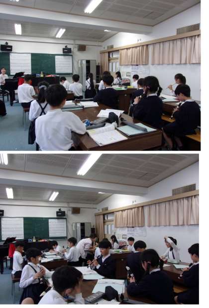 動画で正しく高い「ミ」を出すやり方を観て、個別に練習しているところを、先生が近くに寄っていい音が出ているかチェックしていきます。
