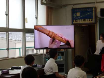 4年2組の音楽の授業です。3年生からリコーダーを1年間使ってきて、今日は高い「ミ」の音を出すサミングという技法の学習です。
