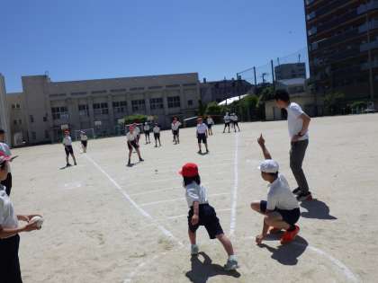 1年生は遠くまでボールを飛ばそうと一生懸命頑張っていました。