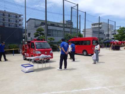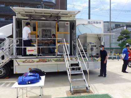 体験・展示コーナーでは、さっそく起震車に乗って、地震の揺れを体験されている方がいました。その横では、ミニ消防車に乗って記念撮影されている方も。