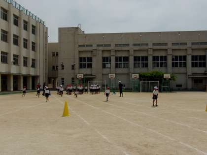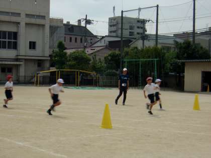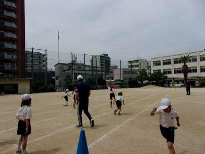準備運動では、ストレッチの仕方、走るときの手の振り方などを教えていただき、そのあとで、スキップや「馬走り」・「大股マリオ走り」など、土をしっかりと踏み込むことを意識できるような走り方を体験しました。