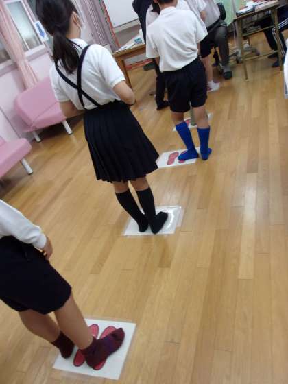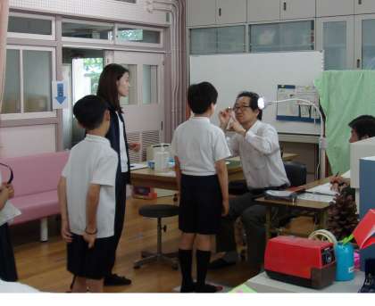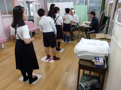 検診を受ける子どもたちは、保健室内の指定された場所で、並んで待ち、検診前には「おねがいします」、検診が終わったら「ありがとうございました」ときちんと言うことができていました。