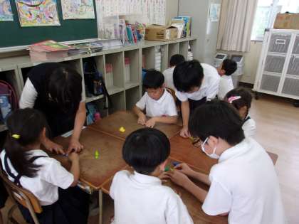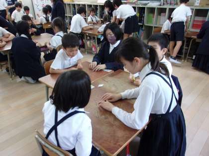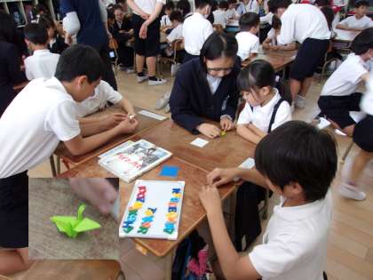 1年生の教室では、6年生が修学旅行で平和記念公園に納める「平和の折り鶴」の折り方を1年生に教えていました。折り鶴は、折り紙の中でも難しい方で、しかも持って行く加減で、小さな折り紙で「鶴」を作っていくので、1年生には、かなり難題です。