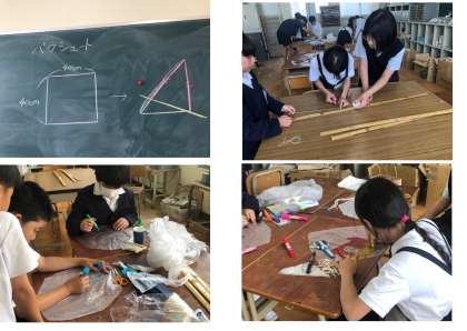 この日は、自然科学クラブでは、パラシュートを制作していました。傘となるビニールを正8角形に切り、同じ長さに切った8本のタコ糸を、ビニールの8つの角に貼り付けて出来上がりです。糸を切る際には友だちと協力しながら作成していました。