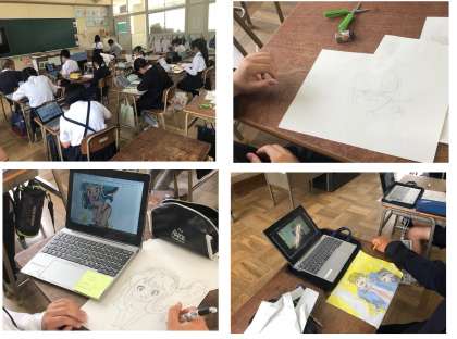 イラスト造形クラブは、各自で思い思いのイラストを描き、それをラミネートすることで下敷きを作っていました。タブレットでイラストの原画を探す人もいれば、自分の頭にあるイメージを絵にしている人もいました。さすが、イラスト造形クラブを選んだ人たちです。絵のクオリティの高さに驚かされました。