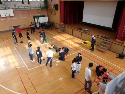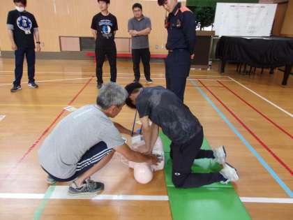 都島消防署の隊員の方に講師として来ていただき、教員は全員が、傷病者の発見から、胸骨圧迫、AEDの使用までの一連流れを訓練用の人形とAEDを使って実技体験をしました。
