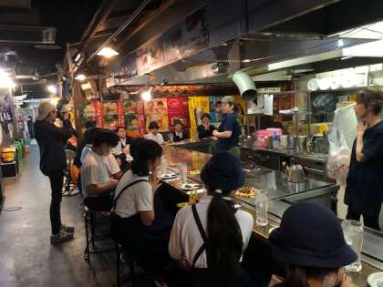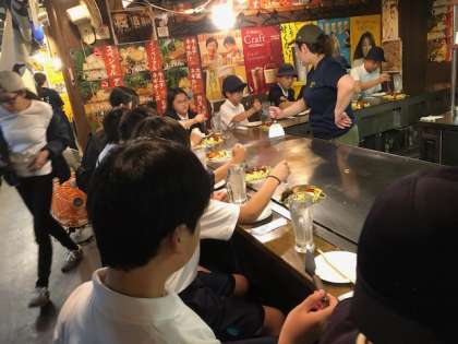 お店によって、箸ではなくコテを使って食べるようになっていて、コテの使い方のレクチャーまでありました。