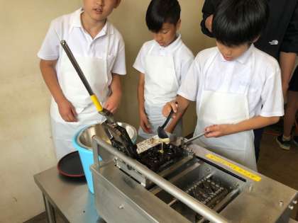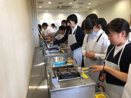 生地と具材をのせたものを、もみじ饅頭焼き機で、両面を30秒ずつ4回焼きます。横にある時計を見ながら真剣に取り組んでいました。