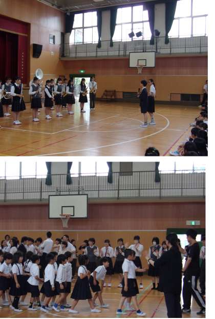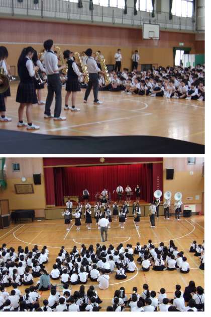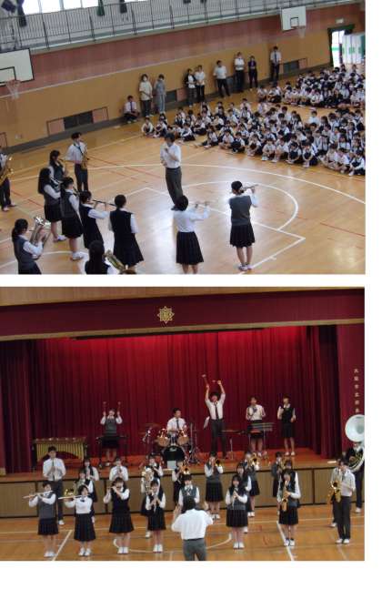 3時間目に予定されている日曜参観の日、2時間目の時間帯で、大阪府立東高校のブラスバンド部に来ていただき、演奏を聴かせていただきました。