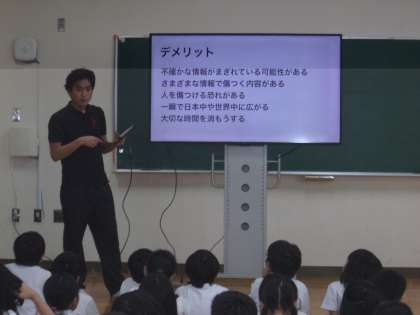 子どもたちのSNSの使用は、学校では管理することができず、自分の責任でしっかりと考えて使用してほしいと思います。ご家庭でも、スマホの使い方について、お話をしてください。