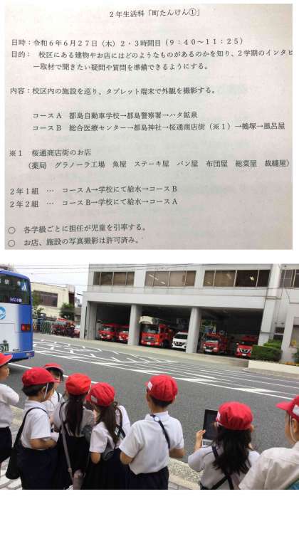2年生の生活科「町たんけん(1)」で、校区内にある様々な施設やお店をまわりました。