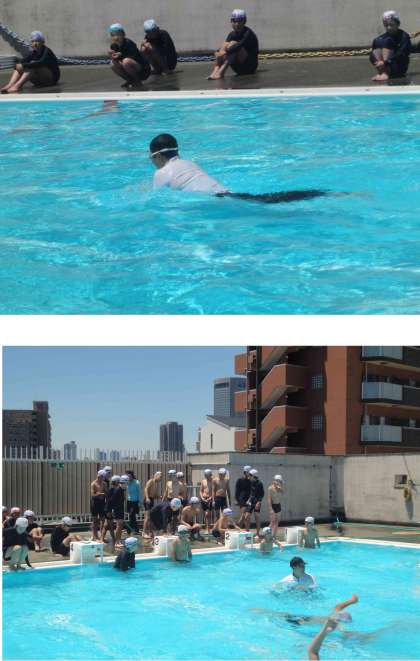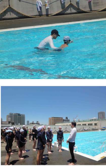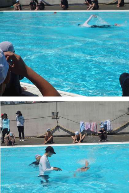 「クロールで前で手を合わせてはいけない。」「平泳ぎでは、浅いところの水を捕まえる」など、具体的なコツを教えていただき、それを実践していく指導スタイルは、小学校の教員にも指導方法の勉強となりました。