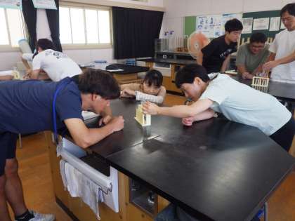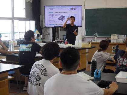 また、2講目として理科室で研修担当の教員から、数種の水溶液を色やにおい・リトマス紙・蒸発による残物などで区別する実験を実際に行い、安全面を中心に実験の手法を学習しました。