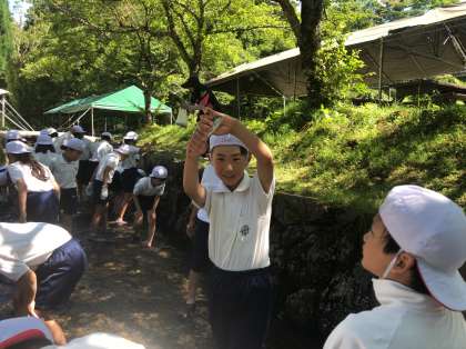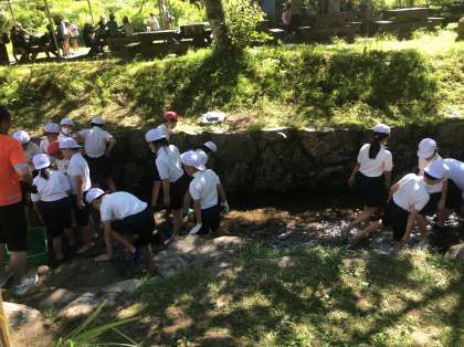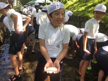 宿舎から少し離れた川で魚つかみです。円山川の源流近くなので、水はとても冷たいです。
