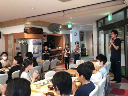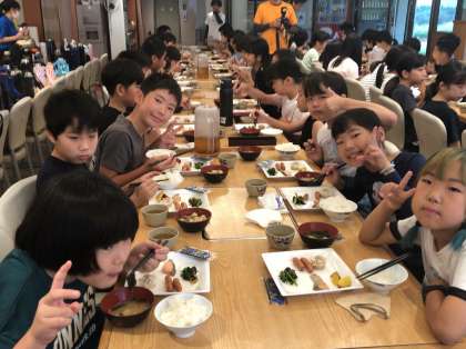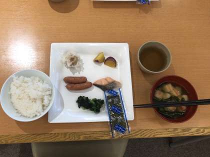 朝食の時間です。メニューは、焼き魚・ウィンナーなど種類も豊富です。係の合図でいただきます。