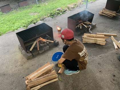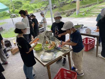 カレーライス作りが始まりました。ご飯・具材・かまどの係に分かれて、活動を進めていきます。