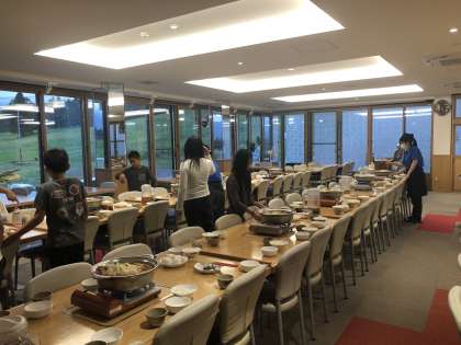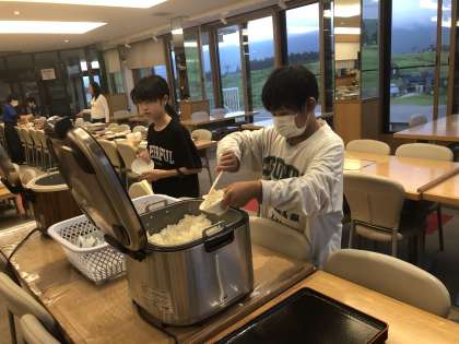 食事係さんが、ご飯をよそって、お茶を入れて配膳しています。