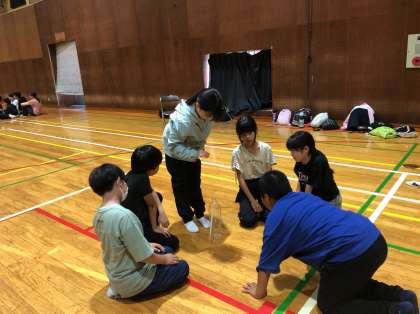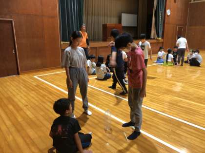 ペットボトルに割り箸を入れるゲームです。班で入った数を競います。