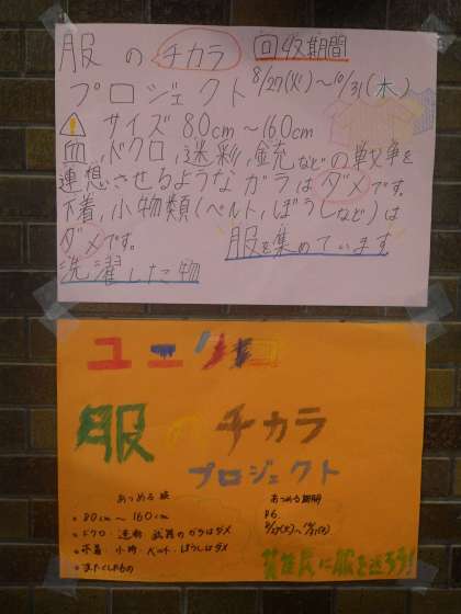 進学先中学校である都島中学校のボランティアクラブの生徒が「服の力プロジェクト」に参加し、子ども服を集めるボランティア活動を行っています。