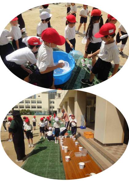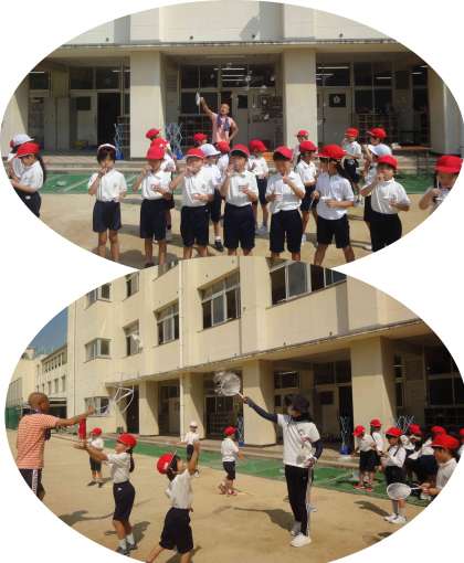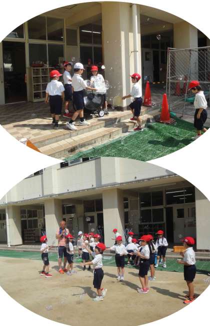 1年生では、生活科の学習としてシャボン玉を飛ばす経験をしました。道具はストローの外、うちわ・かご・大きな輪っかなどを使いました。