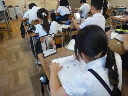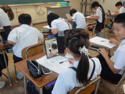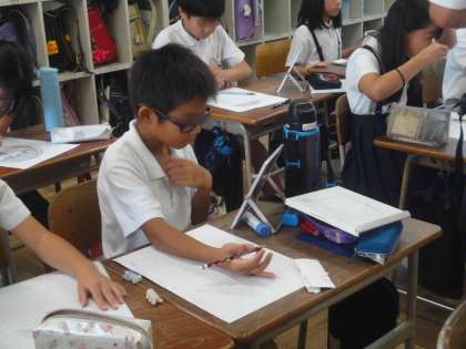 4年生では、図工で自画像を描いていました。鏡を見ながら眉毛の生え方や、細かな「しわ」なども忠実に描いていました。