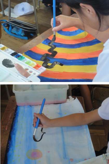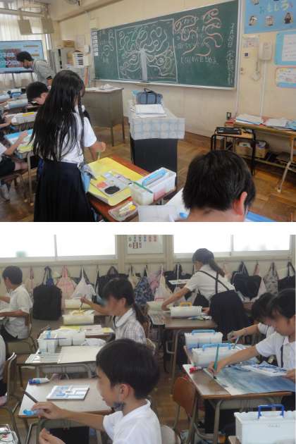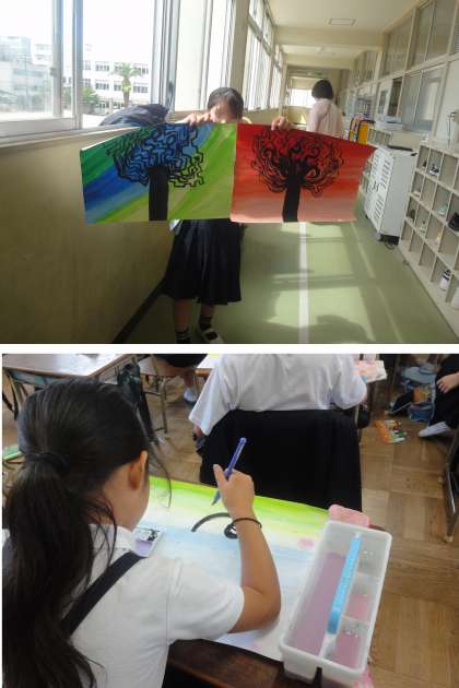3年生は図工で、「くねくねの木・カクカクの木」に取り組んでいました。画用紙に絵の具の明るい色を使ってグラデーションなどの技法で背景を描き、その上に黒の絵の具で「くねくね」や「カクカク」の木を描き進めていきます。