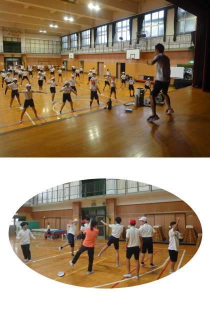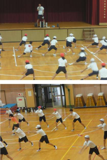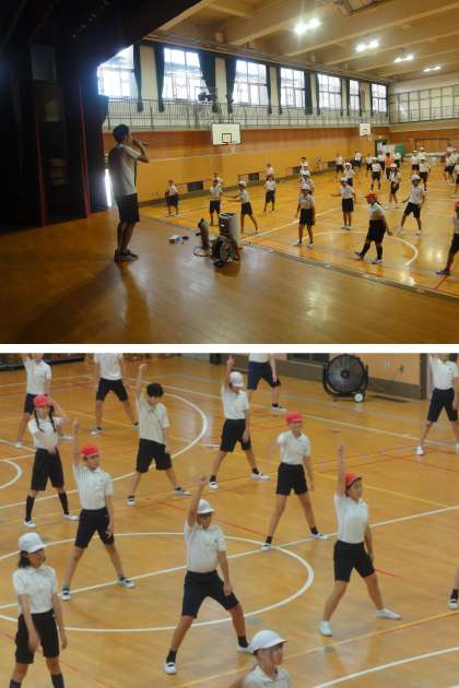 体育館で6年生が、団体演技「南中ソーラン」の動きを知る段階の練習をしていました。給水タイムの後などの、ちょっとした時間を使って、先生と動きの確認をしていて、練習している表情にやる気がみなぎっていました。