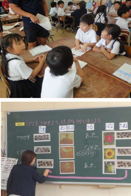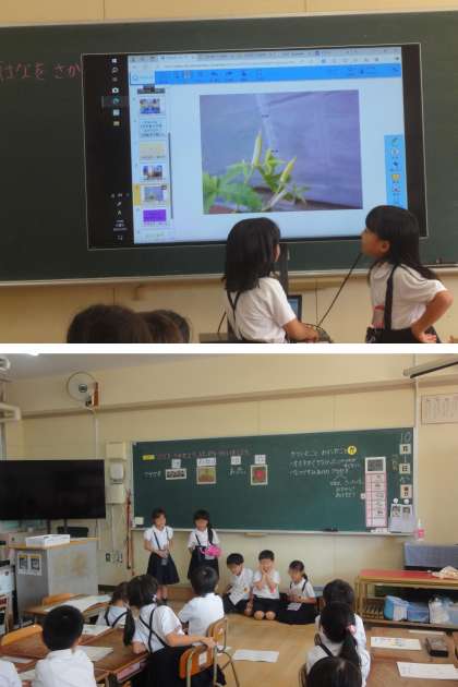 1年生の生活科「はなを さかせよう」の授業が、校内の研究授業として実施されました。1年生のみんながこれまで育ててきたいろいろな植物について、栽培活動を振り返り、劇やプレゼンなどで発表し、同じところや違うとこなどを話し合いました。