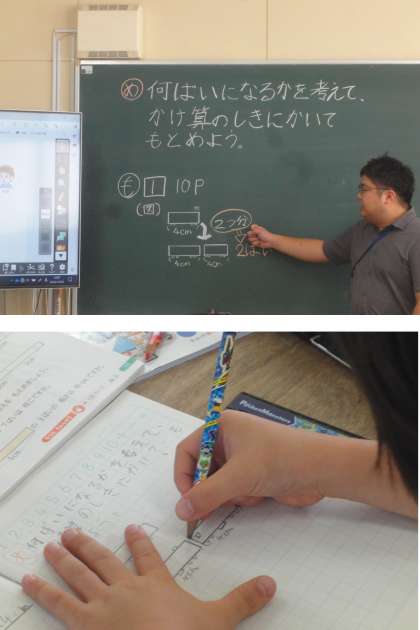 4cmの電車のおもちゃを3両つなげることで、長さが「3倍」という言葉と意味を知ります。学習規律をしっかり守り、意欲的に取り組んでいました。
