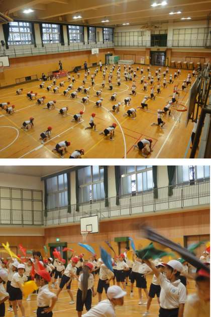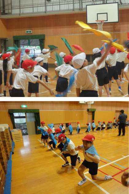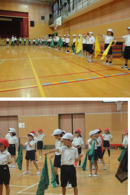 1・2年生が合同で、運動会で披露する団体演技の練習を体育館で行っていました。手にはバンダナをもって演技をしていましたが、当日本番は、別の物を使うそうです。何を持つかはお楽しみ。